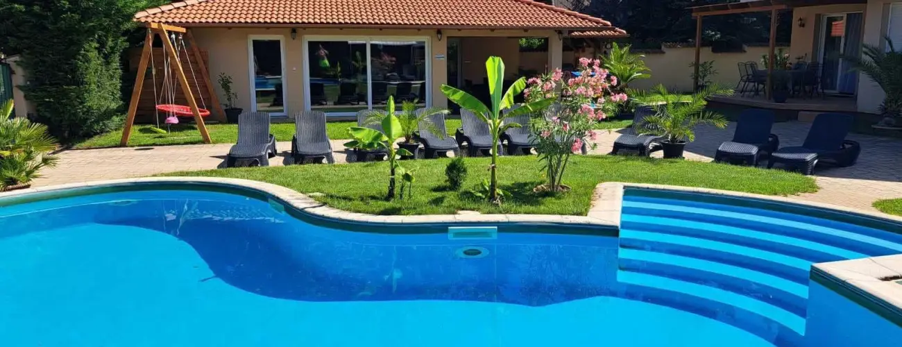 Az apartmanház parkosított kertje szintén a családias hangulatot és a nyugalmat szolgálja. Az udvarban található 1,70 m mély és 4m x 8m széles úszómedence, 0,5m mély és 3m x 3m széles gyermekbarát pancsolóval, a hozzá tartozó napozórésszel és a kényelmes napozó ágyakkal, kiváló pihenést biztosít a kisgyermekek és a felnőttek részére is.