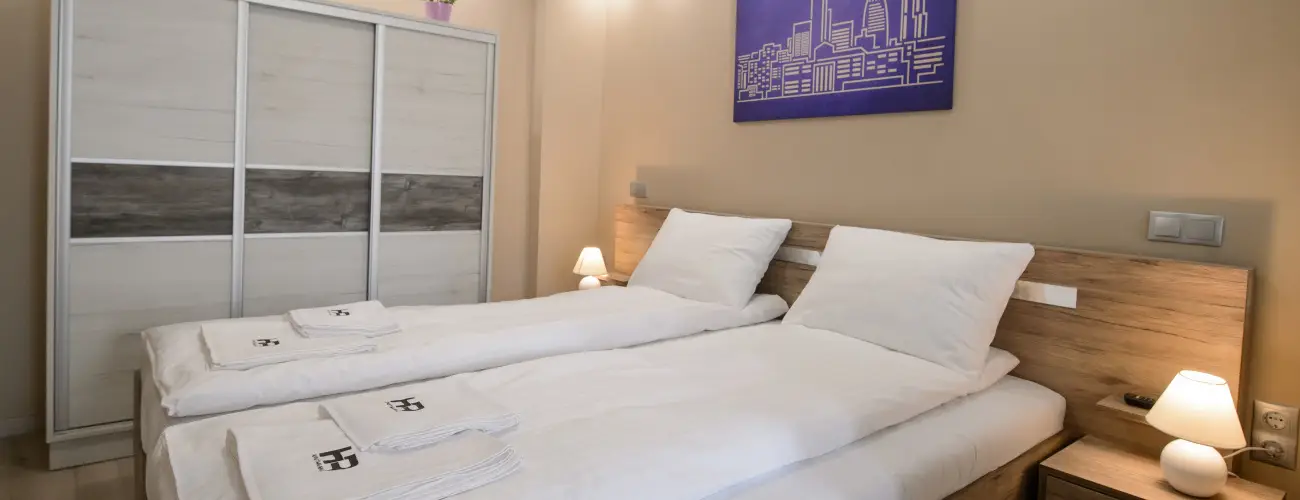 Az apartmanok tematikáját világvárosok ihlették, melyek fantázia nevei New York, London, Paris, Budapest és az Art Legends, hűen tükrözve az apartmanok hangulatát. Légkondicionálóval, Wi-Fi-vel, TV-vel, étkezősarokkal, teljesen felszerelt konyhával, hajszárítóval ellátott, saját fürdőszobával rendelkeznek. A fiatalos, tágas apartmanokban mikrohullámú sütő, hűtőszekrény, tűzhely és vízforraló szintén biztosított. Kellemes, nyugodt környezetben, 3 emeleten elhelyezkedő apartmanok közül városra, sétálóutcára néző kilátással, tökéletes lehetőséget nyújt mind a pihenésre, kikapcsolódásra vágyóknak, családoknak, pároknak, mind pedig az üzleti útra érkezőknek, minden igényt kielégítve.