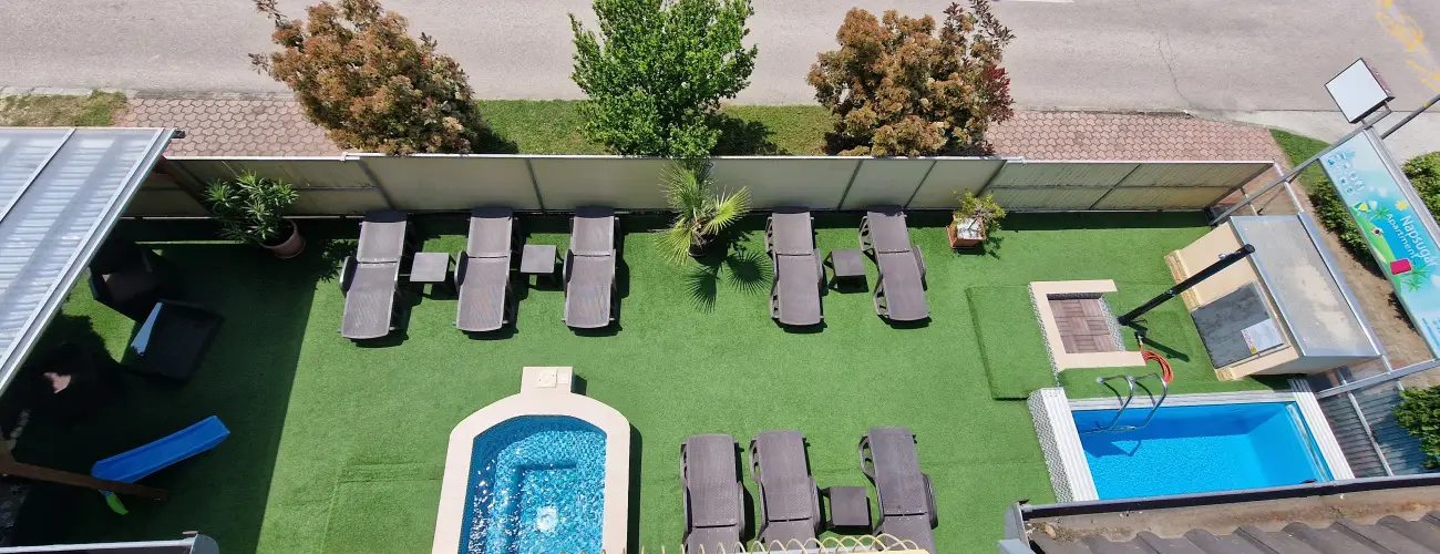 A Vendégek 2-3-4 fős apartmanok közül választhatnak.Az apartmanok földszinti teraszosak vagy emeleti erkélyesek, amelyeknek többségük Balatoni panorámával rendelkezik. LCD tv-vel, klímával, 2 személyes franciaággyal, mikrohullámú sütővel és hűtővel, valamint konyhasarokkal felszereltek. A kikapcsolódni vágyókat a napozó udvarban medence és jacuzzi várja. A bárban kávékat, üdítőket és hűsítő italokat fogyaszthatnak.