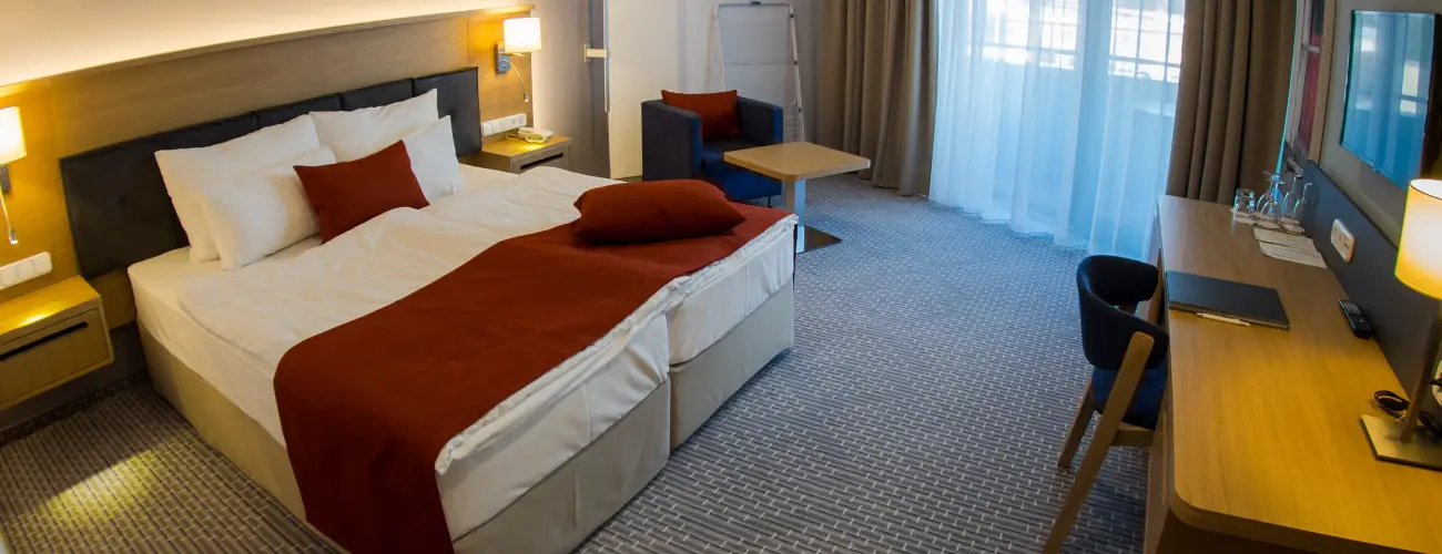 92 korszerűen kialakított standard és superior szoba (28 és 38 négyzetméter) és 2 lakosztály (115 négyzetméter), illetve az elsőrangú szolgáltatások készen állnak arra, hogy az itt tartózkodást felejthetetlen élménnyé tegyék a vendégek számára. Mindegyik szoba légkondicionált, fürdőszobával és toalettel, széffel, telefonnal, hajszárítóval, LED televízióval és Wi-Fi internettel felszerelt.